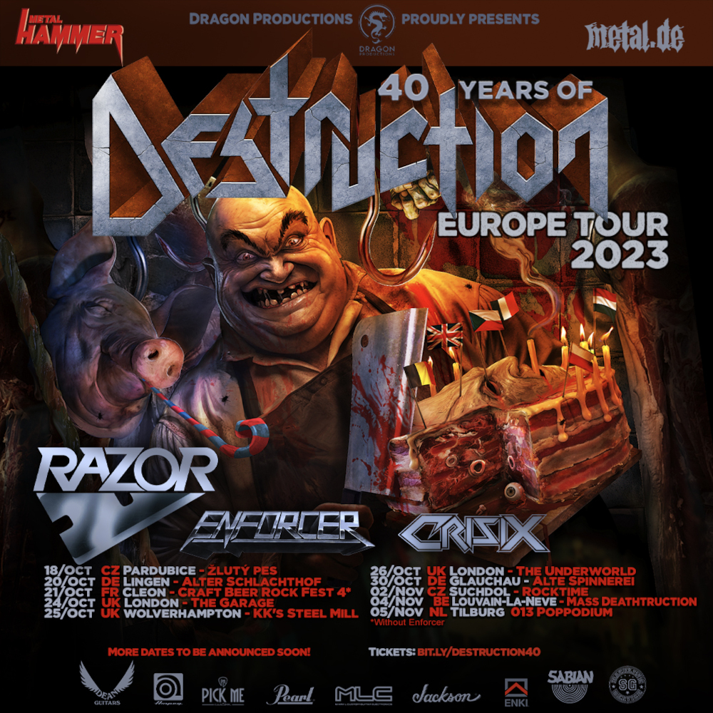 Hiermit kündigen Dragon Productions voller Stolz die mit Spannung erwartete 40-Jahre-Jubiläumstour der deutschen Thrash-Ikonen DESTRUCTION an. Diese monumentale Tour markiert einen bedeutenden Meilenstein in der Karriere der Band und denn das Jubiläum findet in der Heavy-Metal-Scene weltweit sehr viel Beachtung. Mit Shows in Großbritannien, Deutschland, Tschechien, Frankreich, Belgien, den Niederlanden und bald auch weiteren Ländern, verspricht diese Tour ein legendäres und unvergessliches Erlebnis für alle Metalheads zu werden.